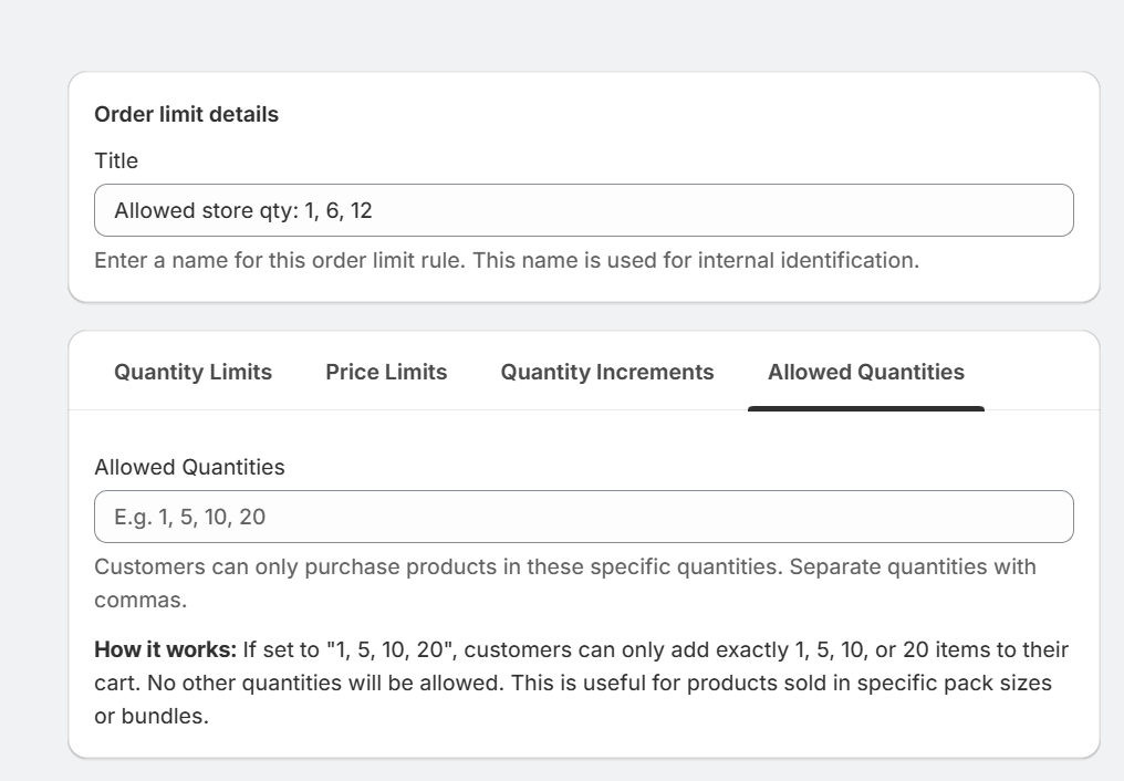 Allowed Quantities lets you control the exact number of items a customer can purchase (e.g., 2, 4, 6). This is useful for fixed pack sizes, wholesale rules, or managing preorder batches.