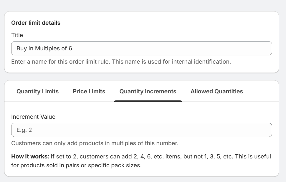 - Enter the exact increment value that customers are allowed to purchase. (e.g., 2, 4, 6)