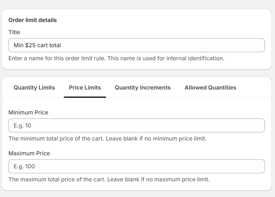 Price limits let you set the minimum and maximum order value a customer can spend. This is useful for wholesale thresholds, limiting large purchases, or encouraging higher cart values