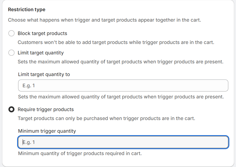 - Require trigger products: Target products are only allowed when trigger products are in the cart. The "minimum trigger quantity" sets how many trigger items must be present to allow targets.