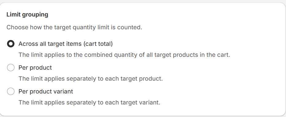 - Per product variant: The limit is applied separately to each target variant, so each variant gets its own cap.