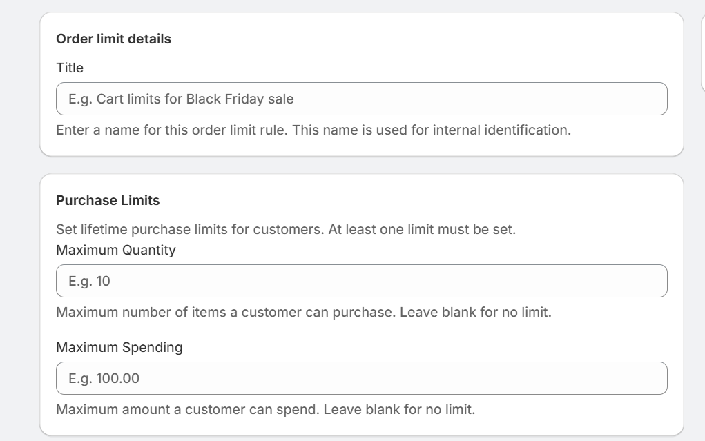 - Run limited releases and prevent resellers by capping each customer’s lifetime purchases of specific items.