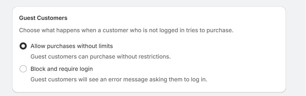 Recommendation: For limited-edition releases or anti-reseller protection, choose "Block and require login." For general inventory management, "Allow purchases without limits" typically provides a better customer experience.