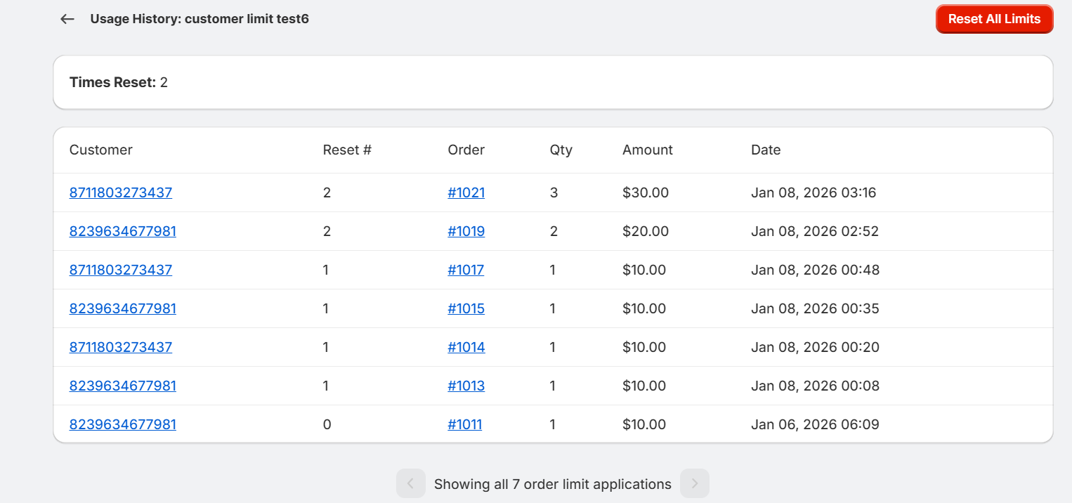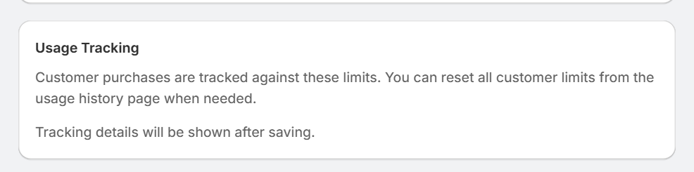 Purchases are tracked against these limits. Tracking details appear after saving. You can reset customer limits from the usage history page.