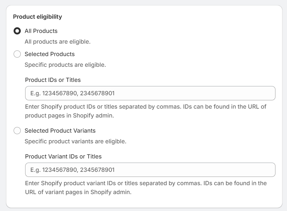 - Product IDs: The numeric identifier found in Shopify admin URLs (e.g.,