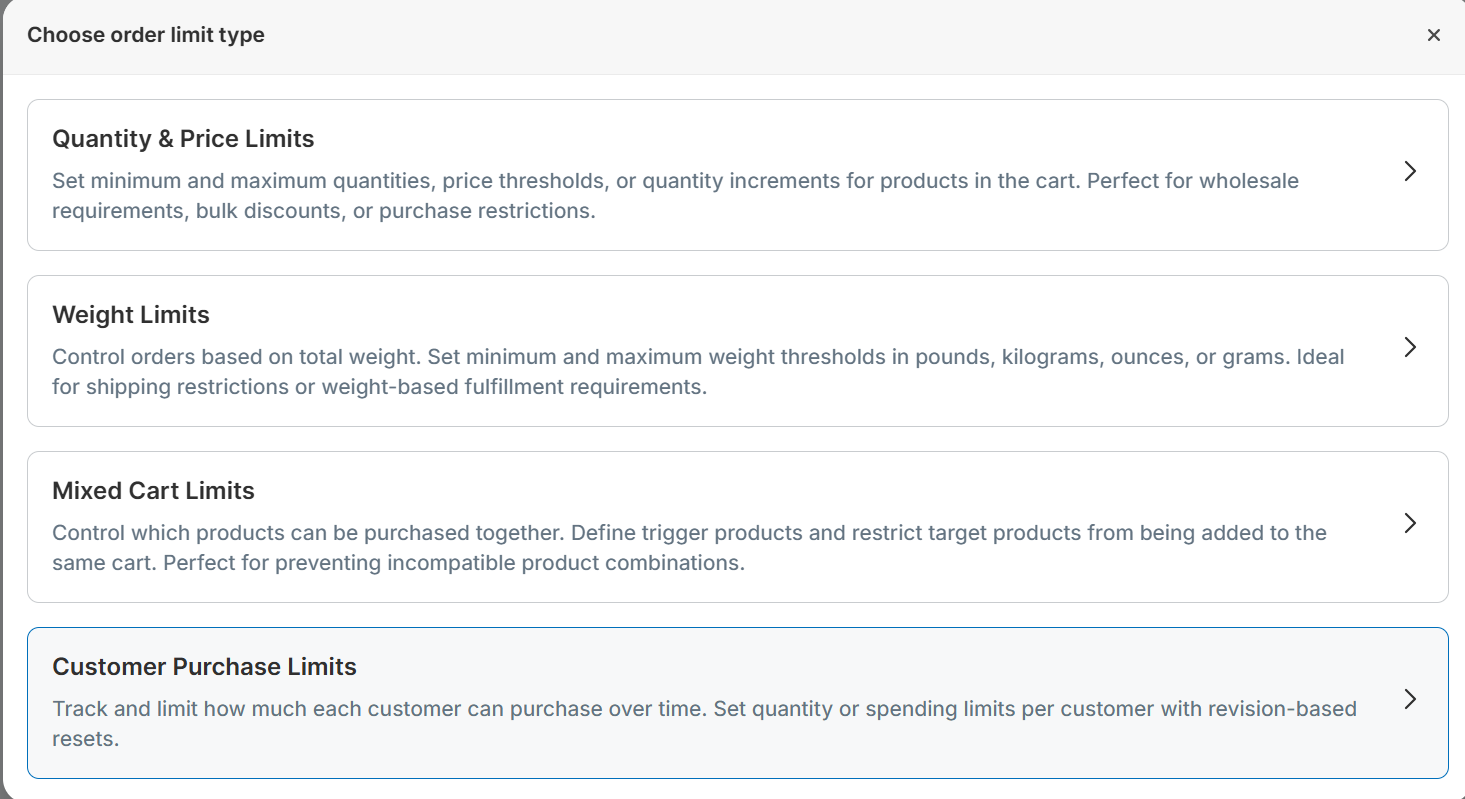 Customer purchase limits let you track purchases per logged-in customer and enforce lifetime maximums for quantity and or total spend across selected products or variants.